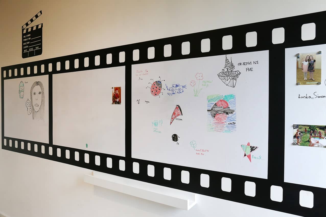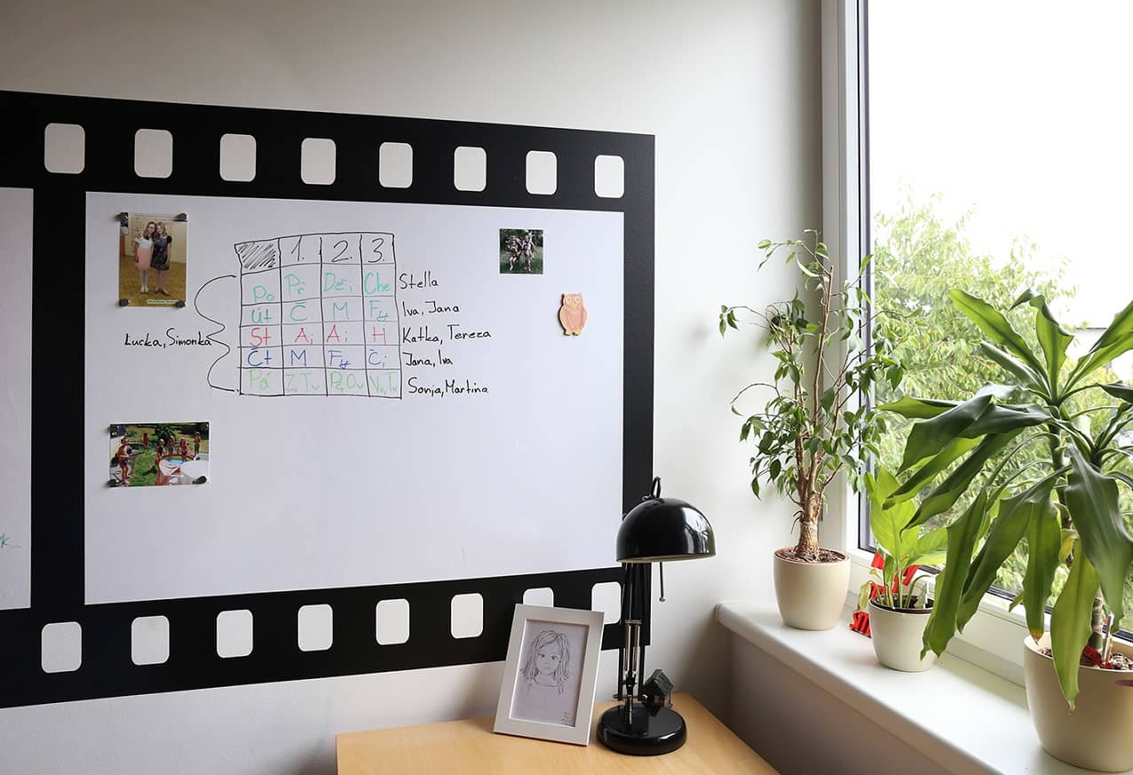 Nástěnka na míru ve tvaru filmového negativu je nejen atraktivní, ale i praktická. Dívka na ni může psát, kreslit nebo připevnit fotky a důležité věci pomocí magnetů.